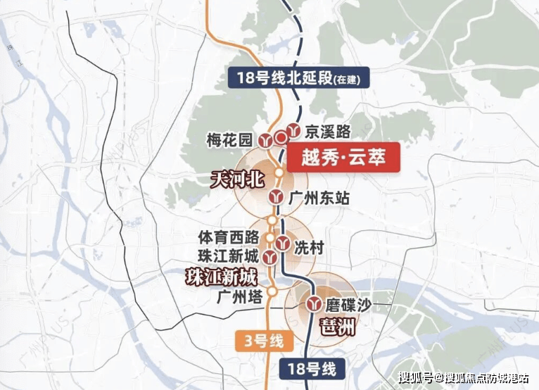对于工作在珠江新城、琶洲的都市菁英而言,通勤效率是衡量生活品质的首要标尺。越秀·云萃在交通维度上拥有“王炸级”配置。项目是真正的“地铁上盖”,18号线京溪路站出口即位于社区楼下,实现了“归家零距离”。18号线公里的市域快线,是广州面向未来的“南北大动脉”。从京溪路站出发,乘坐18号线可无需换乘,一线直达珠江新城(冼村站)、琶洲(磨碟沙站)、广州东站、万博(南村万博站)等全市几乎所有核心商务区。根据测算,未来通车后,两站即可速达珠江新城,通勤效率产生质变。